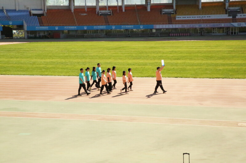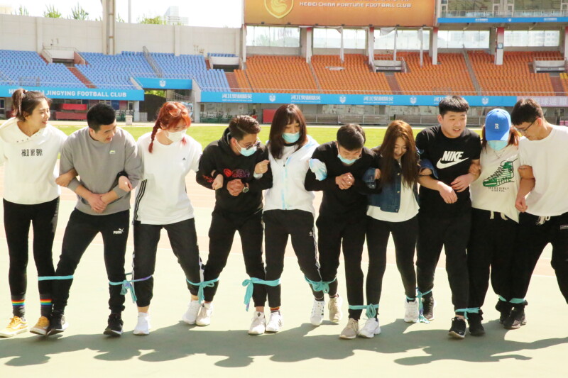 (每組選取10名參賽者,將左右兩人的其中一只腳綁在一起,大家一起從起點(diǎn)行至終點(diǎn))